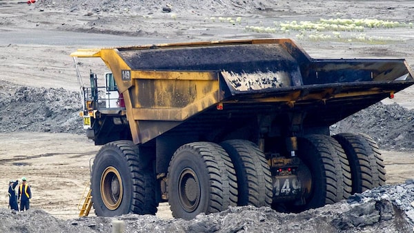 Workers talk near a Caterpillar Inc. mining truck at Syncrude Canada Ltd.'s oil sands North Mine in Fort McMurray, Alta.Jimmy Jeong/Bloomberg