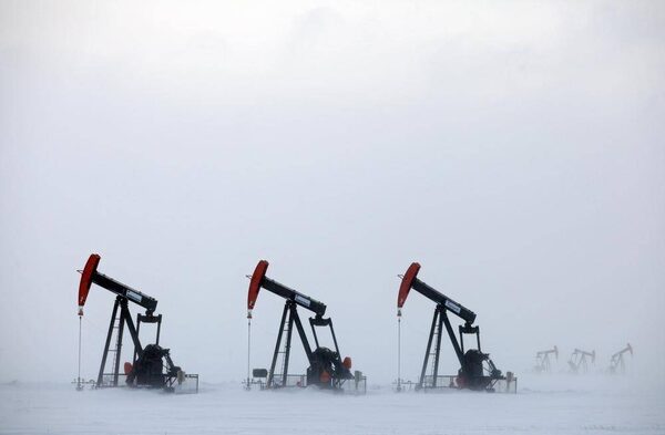 Rows of pump jacks stand out against the snowy landscape amidst flurries southeast of Waskada, a small town in southwestern Manitoba.Tim Smith/The Globe and Mail
