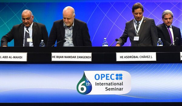 Minister of Oil of Iraq, Adil Abd Al-Mahdi, Iranian minister of oil, Namdar Zangeneh, Venezuela's Minister for Petroleum and Mining, Asdrubal Chavez J, and Secretary General of the International Energy Forum, Aldo Flores-Quiroga arrive at OPEC's 6th international seminar at Hofburg Place on June 3, 2015 in Vienna.JOE KLAMAR/AFP / Getty Images