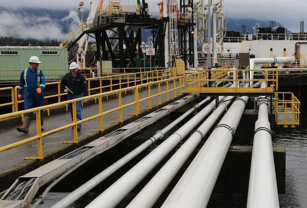 Workers walk to a jet fuel barge at Kinder Morgan’s Westridge Terminal in Burnaby, B.C., earlier this month. Ottawa’s green light for Kinder Morgan’s Trans Mountain pipeline will make the terminal on Burrard Inlet a much busier place once construction is completed.CHRIS HELGREN/Reuters