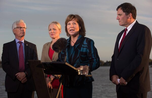 British Columbia Premier Christy Clark, third left, speaks as Jim Carr, from left to right, Minister of Natural Resources, Catherine McKenna, Minister of Environment and Climate Change, and Dominic LeBlanc, Minister of Fisheries, Oceans and the Canadian Coast Guard, listen after the federal government announced approval of the Pacific NorthWest LNG project, at the Sea Island Coast Guard Base, in Richmond, B.C., on Tuesday September 27, 2016.DARRYL DYCK/The Canadian Press
