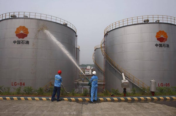 Employees spray water to cool down oil tanks at a PetroChina oil storage facility in Suijing, Sichuan Province August 13, 2010. China National Petroleum Corp. will investigate cash that was skimmed from earnings at units including PetroChina Co. Ltd.© Stringer China / Reuters/Reuters