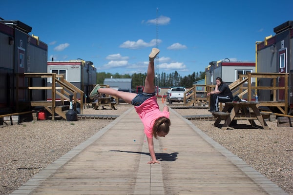 A young girl who was evacuated due to the Fort McMurray wildfire plays at an oilfield work camp where approximately 500 evacuees are staying, in Wandering River, Alberta, Canada, on Sunday, May 8, 2016.Darryl Dyck/Bloomberg