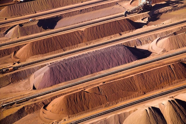 Stockpiles of iron ore at the Rio Tinto Parker Point ship loading terminal in Australia. Iron ore fell below $39 (U.S.) a metric tonne last week, a record low in daily prices dating back to 2009.Rio Tinto/Reuters