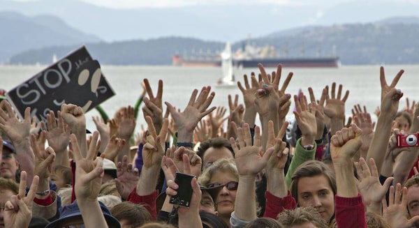 Protestors gathered on Kitsilano Beach hold up their hands to show their opposition to the Northern Gateway Pipeline and the use of oil tankers in local waters in Vancouver, British Columbia June 3, 2012.ANDY CLARK/Reuters