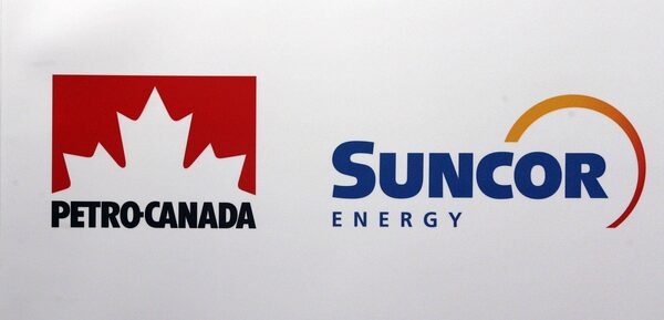 The logos for Suncor and Petro-Canada at a press conference announcing the merger of the two companies in Calgary on Monday March 23, 2009 .LARRY MACDOUGAL/The Canadian Press