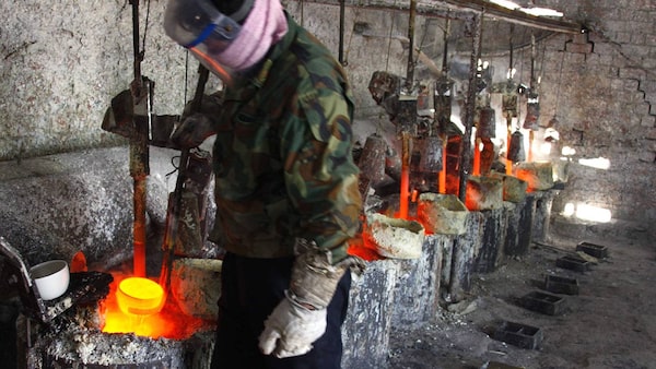A worker prepares to pour the rare earth metal Lanthanum into a mould near the town of Damao in China's Inner Mongolia Autonomous Region Oct. 31, 2010. China is limiting its exports of valuable rare-earth minerals, leading technology and automotive firms to look elsewhere for the metals, which are used in hybrid vehicles, computer batteries and smartphones.DAVID GRAY/REUTERS