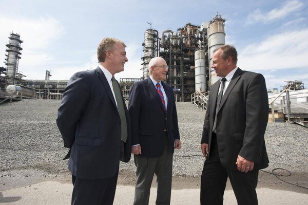 From left: Paul Browning and Arthur Irving, CEO and chairman, respectively, of Irving Oil; and Stefan Pohlod, president for the eastern energy pipeline; gather at the refinery in Saint John after the announcement of a proposed pipeline and marine terminal.For the Globe and Mail