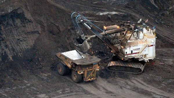 A large excavator loads a truck with oil sands at the Shell Albian mine near the town of Fort McMurray in Alberta.