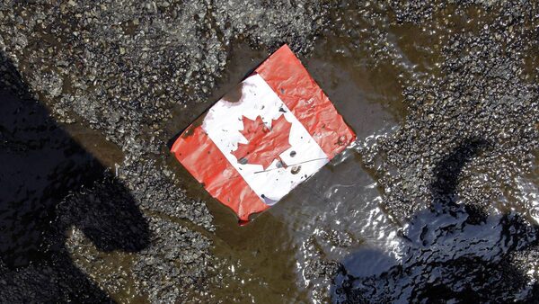 A placard with the Canadian flag rests on the ground covered in oil as demonstrators conduct a die-in to protest against the Keystone Pipeline and the Alberta Tar Sands outside of the Canadian Consulate in downtown Chicago, Thursday, May 17, 2012.Nam Y. Huh/The Associated Press