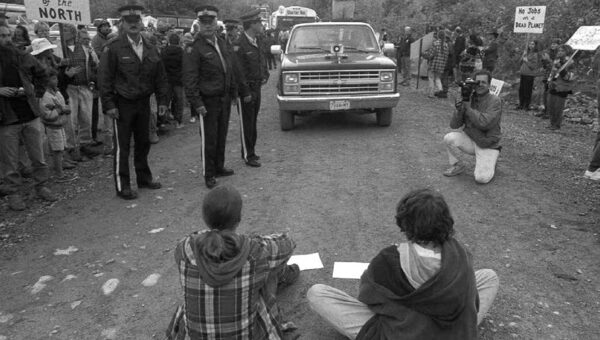 Two protestors block logging trucks to Clayoquot valley near Tofino in 1993.