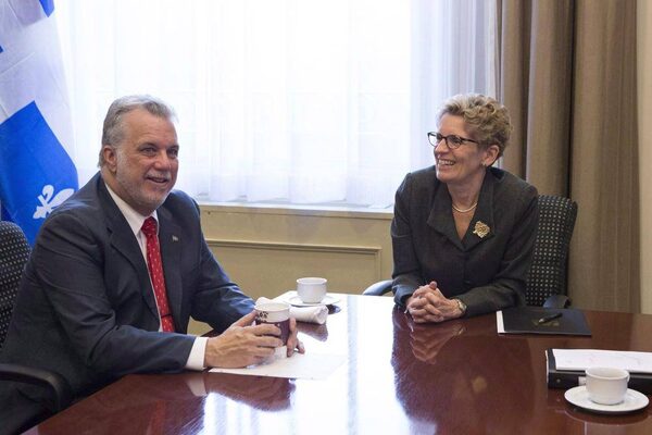 Ontario Premier Kathleen Wynne, right, is shown with Quebec Premier Philippe Couillard in her office at the Ontario Legislature on Nov. 21, 2014.Chris Young/The Canadian Press