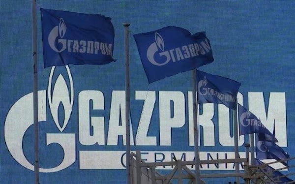 Flags fly near an advertising screen displaying the logo of Gazprom company, in St. Petersburg, November 14, 2013.© Alexander Demianchuk / Reuter