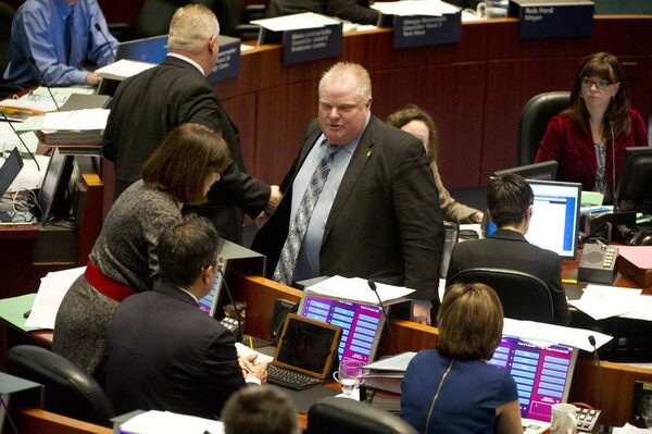 Mayor Rob Ford confronts councillor Denzil Minnan-Wong as speaker Frances Nunziata during a council meeting at city hall in Toronto, Ontario Wednesday, November 13, 2013.Kevin Van Paassen/The Globe and Mail