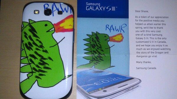 4. A man whose less than skillful doodle of a dragon spawned a small marketing hit for Samsung Canada has finally been rewarded. In May, Shane Bennett sent a request via Facebook to the company for a free Galaxy S III smartphone, before its release in Canada. To sweeten the deal, he included in his message "a picture of a dragon I just drew for you." While Samsung declined the request, its social media manager at agency Cheil Canada responded in kind, with a drawing of a kangaroo on a unicycle. Mr. Bennett posted the comical exchange on online forum Reddit, drawing attention on online social media and in the press. On Monday, Mr. Bennett received the "only customized S III in Canada," with his dragon printed on the phone's exterior. Samsung's gratitude comes at a time when it is grappling with the fallout of losing its U.S. patent battle with Apple Inc., when a bit of good news is welcome.