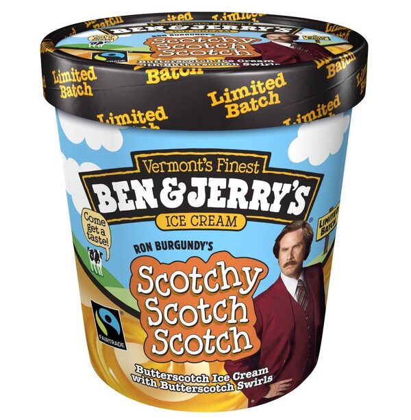Ron Burgundy, the famous news anchor, scotch drinker and blowhard, has been hard at work. Earlier this month, the Will Ferrell character began to appear in a series of online videos for the Dodge Durango. And the co-promotions with brands ahead of the release of the Anchorman sequel continue. This week, Ben & Jerry's unveiled a limited edition butterscotch ice cream called "Scotchy, Scotch, Scotch," and featuring the fictional reporter on the package. LeeAnne Stables, president of consumer products at Paramount Pictures, called it "an exciting and delicious way to build anticipation for the film." In a statement, Mr. Burgundy noted his other flavour suggestions for the brand: "Malt liquor marshmallow, well liquor bourbon peanut butter, and cheap white wine sherbet."