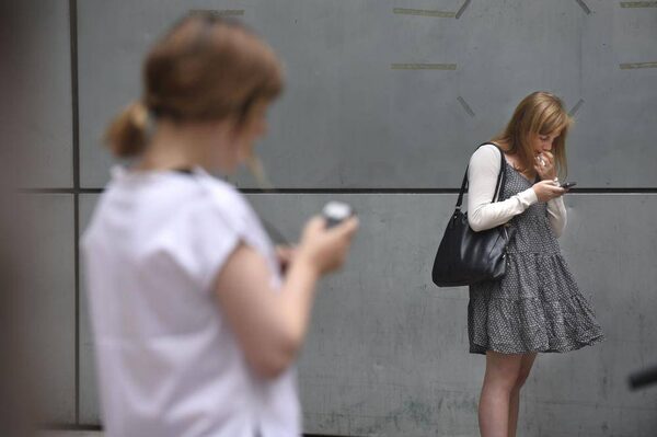 Two women use their mobile phones outside the Toronto Eaton Centre on July 3, 2014. A new report finds that a greater proportion of Americans shop online than Canadians.Fred Lum/The Globe and Mail