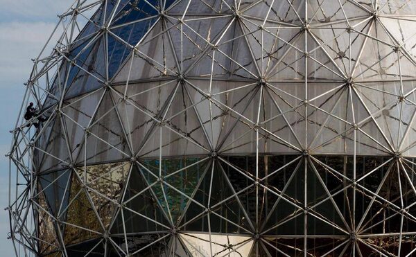 A worker hangs on the side of the geodesic dome roof of the Science World building while performing maintenance in Vancouver, B.C., on Wednesday September 26, 2012. The latest commercial for Science World British Columbia was barred from TV for being too violent. In the ad, produced by agency Rethink, an irrepressibly cheerful man is kicked in the groin, shot by an arrow, set on fire, and hit by a bus to illustrate how optimists feel less pain.DARRYL DYCK/The Canadian Press
