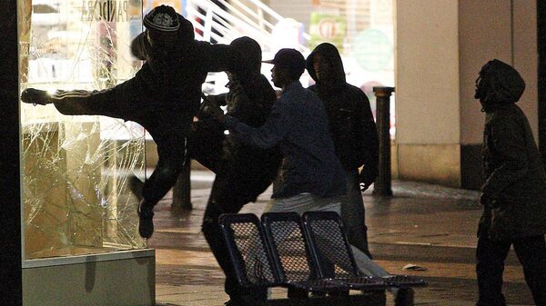 People try to kick in the window of a jeweller's shop near the Bullring shopping centre in Birmingham, central England, as violence spread outside London Monday, Aug. 8, 2011.David Jones/AP