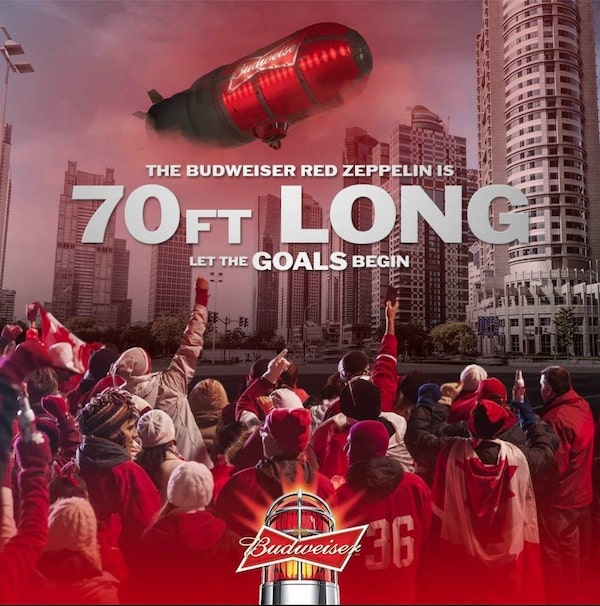 In advertising for the "Budweiser Red Zeppelin" on the brand's Facebook page, a message invites consumers to "show your support for Canada" by sharing the picture of the light. The blimp is a replica of a product Budweiser began selling last year: red goal lights that could be programmed to go off every time the owner's favourite National Hockey League team scores a goal. Now Budweiser is advertising the fact that those goal lights can now be programmed to do the same with the men's and women's Canadian Olympic hockey teams. All the promotional material on social media includes a fine-print disclaimer that "Budweiser is not an official sponsor of the Olympic Games, the 2014 Sochi Olympic Games, Hockey Canada or the Canadian Olympic Committee and this campaign is not licensed by, sponsored by, or otherwise associated with those parties." Of course, Budweiser is not an NHL sponsor either – it lost that partnership to Molson.