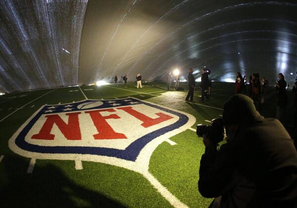 The NFL logo at midfield of MetLife Stadium is illuminated by lights on television reporters' videocameras as members of the media are given a tour under a tarp used by crews to keep the turf dry ahead of Super Bowl XLVIII, Wednesday, Jan. 15, 2014, in East Rutherford, N.J.Julio Cortez/The Associated Press