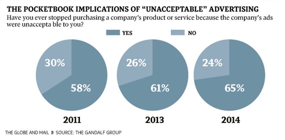 The bad news: consumers who see ads like this will change their buying habits. Sixty-five per cent said they have stopped purchasing something because the company’s ad was unacceptable – and that number has been on the rise in recent years.
