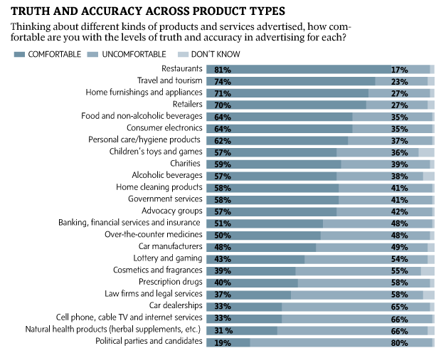 The study looked at which types of advertising, by industry, people trust the most. Restaurants, travel and tourism, homewares and retailers all ranked highest in terms of people’s comfort with truth and accuracy in their ads. Politicians, natural health brands, telecommunications companies, car dealers and lawyers all scored low.