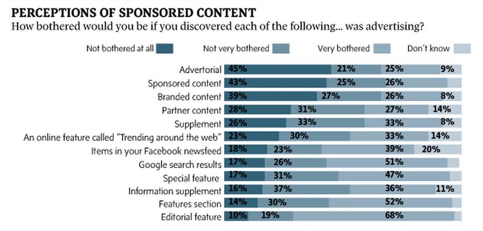 Some of it is old hat. Most of the people surveyed would not be upset to find out that advertorials, or things called sponsored or branded content, were actually ads. However, many more said that they would be upset to discover Google results, features sections or editorial features were ads. The key to success with what has become known as “native advertising,” then, is to make sure people don’t think it is editorial content in the first place.