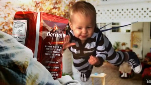 In the spot, an ornery grandma uses a baby's Jolly Jumper as a slingshot, snatching a bag of Doritos from a spoiled child on top of a backyard play set. Chip maker Frito-Lay added a helpful bit of fine print as the infant was hurtled through the air: "Do Not Attempt."