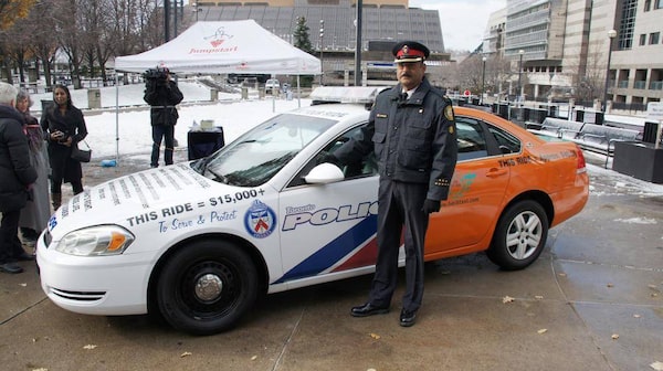 Superintendent Sam Fernandes, Unit Commander of 32 Division, poses beside the Toronto Police Service’s RIDE Frankencar.Constable Tom Rataj
