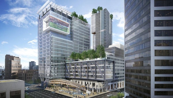 The $750-million plan is to build a total of one million square feet, comprised of a 22-storey office tower and a 46-storey residential tower. For the office tower, there are plans for three interior sky gardens high up, cantilevered out over the street, as well as a public plaza at street level. There will be 450 residential units and cutting-edge green technology, such as a geothermal heat exchange that taps heat from the existing hub of Telus circuits.
