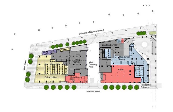While the One York Street and Harbour Plaza Residences is highlighted in orange in this diagram, the circular off-ramp exiting the Gardiner Expressway to the south will have been removed by the time the development opens in 2016, as well as the other fork of the off-ramp that deposits cars at the foot of Bay Street in the right of the diagram. The move will allow for a widening of the existing Harbour Street, which runs along the south side of One York Street, to four lanes heading eastbound.