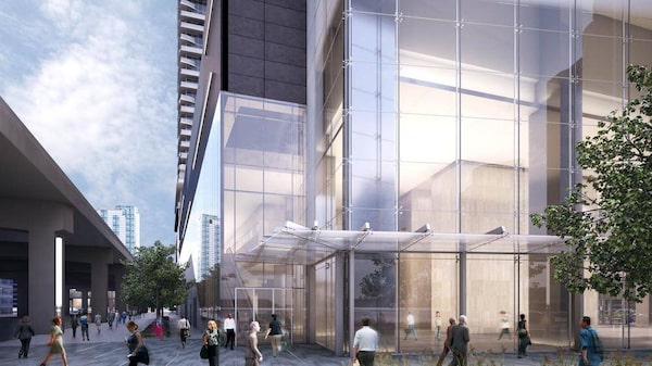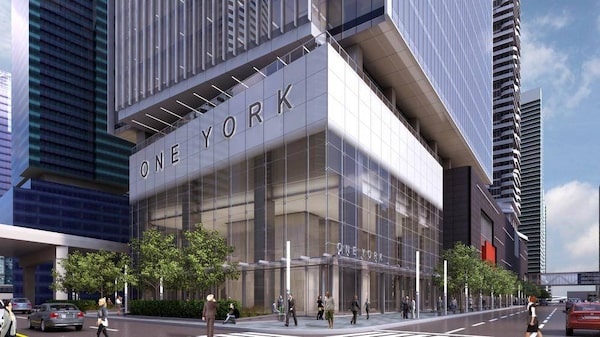 The ground-level glass wall of the One York Street address consists of a cable wall, which comprises large panes of glass trussed together with cables. The 18-metre frameless design, which has been used on buildings such as the AOL-Time Warner Center in New York, will flex slightly in the wind. The section of the podium shaded in red will house a three-storey department store, bringing more retail options to a somewhat sparse area for shopping.