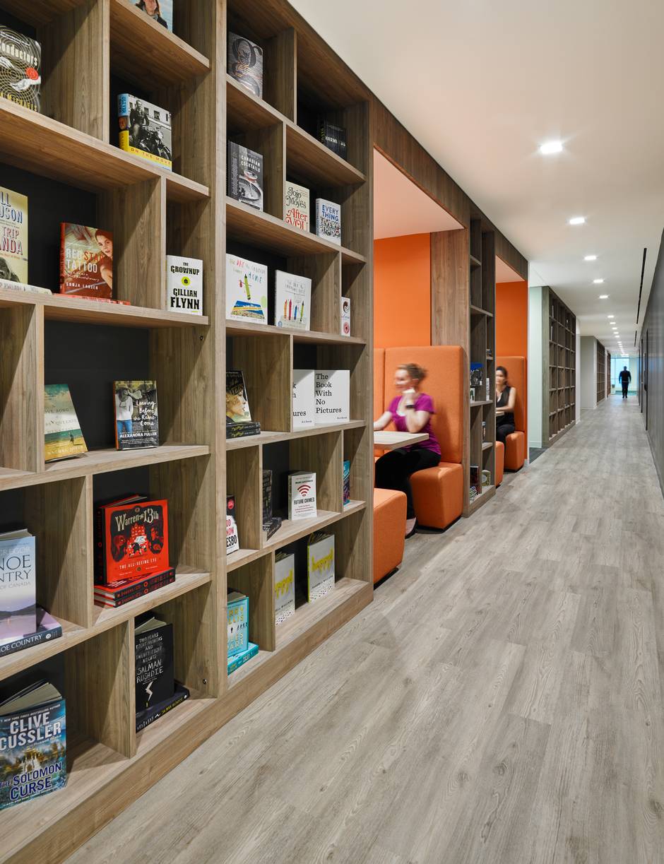 To give the floors distinctive looks, each has a different colour scheme. Penguin’s floor has a palette that veers toward oranges; Random House’s includes more reds and McClelland & Stewart favours blues.
