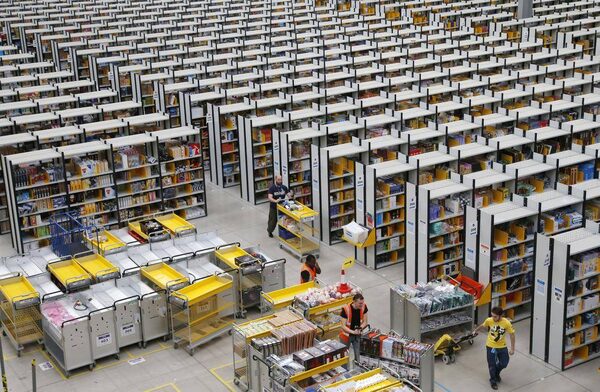 Workers collect orders at an Amazon fulfillment centre in Rugeley, a town in Staffordshire in central England.Phil Noble/Reuters