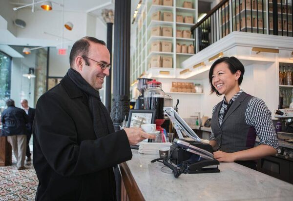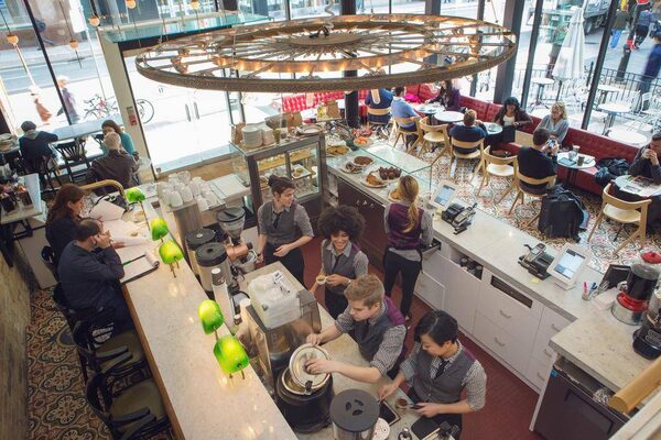 Here, Raymond Aucoin speaks with barista Simona Wong. The owners paid a lot of attention to craftsmanship. “Toronto is a special place. And we’re buying into it; we wanted to make sure that that’s reflected in the coffee shop because you don’t get a lot of that in Toronto.”Jennifer Roberts/The Globe and Mail