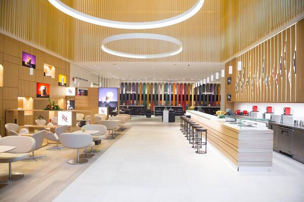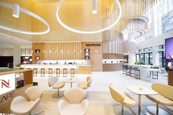 The 14,122-square-foot leased retail space has seating for 47 guests on specially-designed ‘egg’ chairs and Favh sofas which were designed by Denmark’s Fritz Hansen, whose firm creates furniture for all Nespresso boutique bars worldwide.JJ Thompson Co.