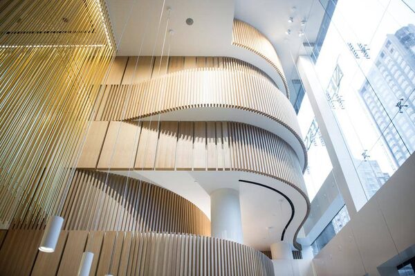 A variety of wood gives the space its golden look. The vaulted space in the bar area features American oak, while the boutique area is clad in multilayer rosewood veneer. “This space is really particular thanks to the lights because of the height and that’s what’s impressive here. For instance, the Paris boutique, it’s more intimate and this one is more about light and space,” says Caroline Desvaux, Nespresso Canada brand manager.JJ Thompson Co.
