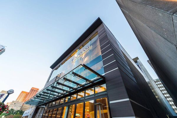 Over a period of nearly a year and a half, Nespresso remade the dated, clunky Cumberland Four Cineplex. The two-storey, open-concept facility now has a floor-to-ceiling glass facade that replaces the concrete theatre front that faced Cumberland Street.JJ Thompson Co.