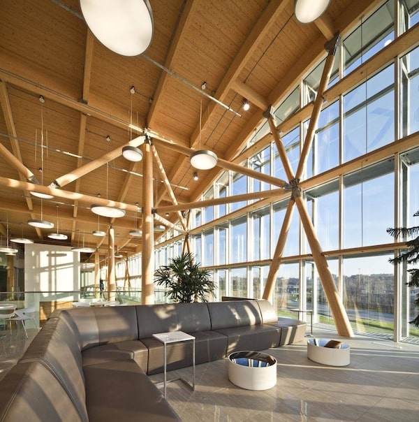 Innovative commercial and public wood buildings are springing up across Canada. Here, the GlaxoSmithKline Inc. administration building in Quebec City, completed in 2011, showcases the flexibility of wooden structures.Stéphane Groleau