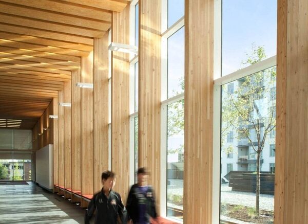 The building used a variety of B.C. wood species, including Douglas fir, western red cedar, hemlock, pine and spruce. The structural design and building envelope focused on engineered wood products: glulam columns and beams, cross-laminated timber, parallel-strand lumber, and laminated veneer lumber.