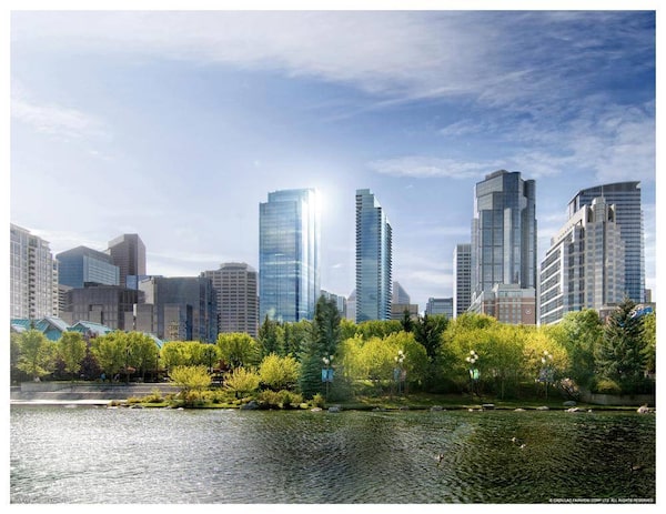 Cadillac Fairview’s mixed-use project, City Centre project, the tallest tower from the left in this rendering, will be located next to the Bow River parkway system and will be connected to the heart of Calgary’s business community.