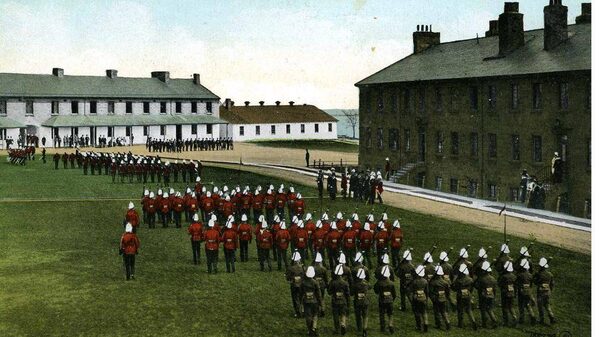 An 1880s postcard shows a British military parade at Stanley Barracks. Initially called New Fort, the barracks were built in the 1840s on what is now the Canadian National Exhibition grounds in Toronto. At the time, the fort was on the shores of Lake Ontario. The foundations of the white barracks buildings will be incorporated into the design for a new hotel.