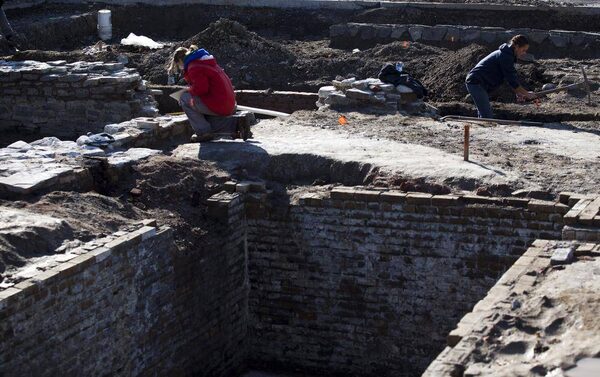 Archeologists Nina Mittendorf, left, and Kristen Hahne work near a massive coal cellar that was dug in the centre of the building years after it was built. Modifications were made to chimneys so coal could be burned rather than wood.Michelle Siu/The Globe and Mail