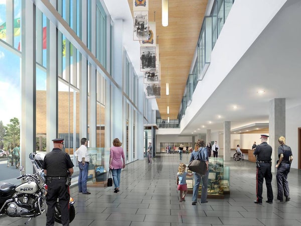 The design features a large, atrium-style lobby and extensively uses glass around the building to maximize natural light. The building will include community meeting rooms, service-focused areas for public records checks, a police heritage display and a publicly accessible gymnasium.