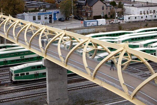The bridge spans the busiest railway corridor in Canada – 16 sets of tracks. It will serve thousands of people every day connecting CityPlace neighbourhood to the King West residential and entertainment area to the north. Friday was ribbon-cutting day for the distinctively yellow bridge.Della Rollins
