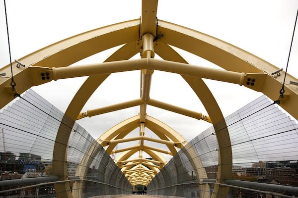 The curved arches and steel tension cables of the newly opened pedestrian bridge, Puente de Luz, that connects the Concord CityPlace condo development to Front Street West in Toronto. The bridge was designed by Chilean sculptor-designer Francisco Gazitua.Della Rollins