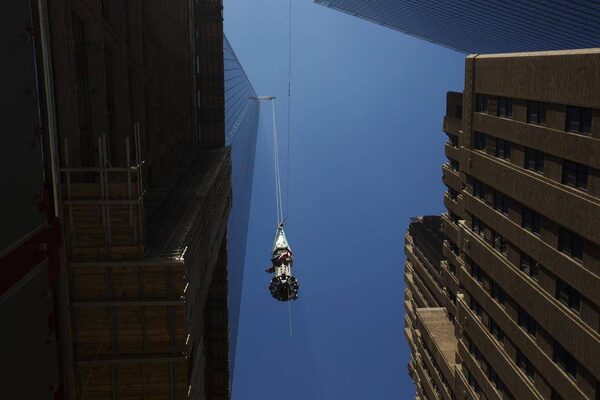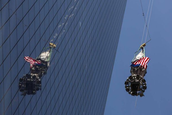 An iron worker uses a line to steady the flag-draped spire before it is lifted to the top of One World Trade Center on Thursday. The final piece helps to fill the void left in the New York skyline by the al-Qaeda attacks of Sept. 11, 2001.LUCAS JACKSON/Reuters