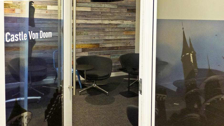 They call it the Digital Garage. Meeting nooks are made from recycled shipping containers. Conference enclosures have names like Fortress of Solitude and Castle Von Doom. And tables are on wheels so work areas can be easily reconfigured to suit the tasks at hand.