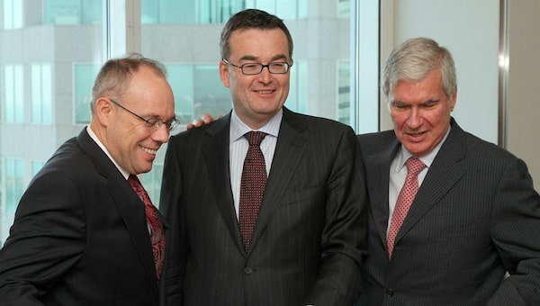 Fran�ois Tougas, left, chairman of Lang Michener's Western Division, with Andrew Kent, CEO of Toronto-based law firm McMillan, and Bob Cranston, Lang Michener's Eastern managing partner, after the two law firms announced their merger this week.Fernando Morales/The Globe and Mail